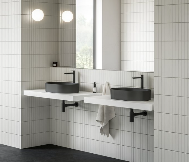 - Doporučené příslušenství: deska pod umyvadlo / skříňka pod umyvadlo k umyvadlu na desku, pevná zátka umyvadla, chromový nebo nábytkový sifon, vysoké baterie Chrome nebo 10°.
